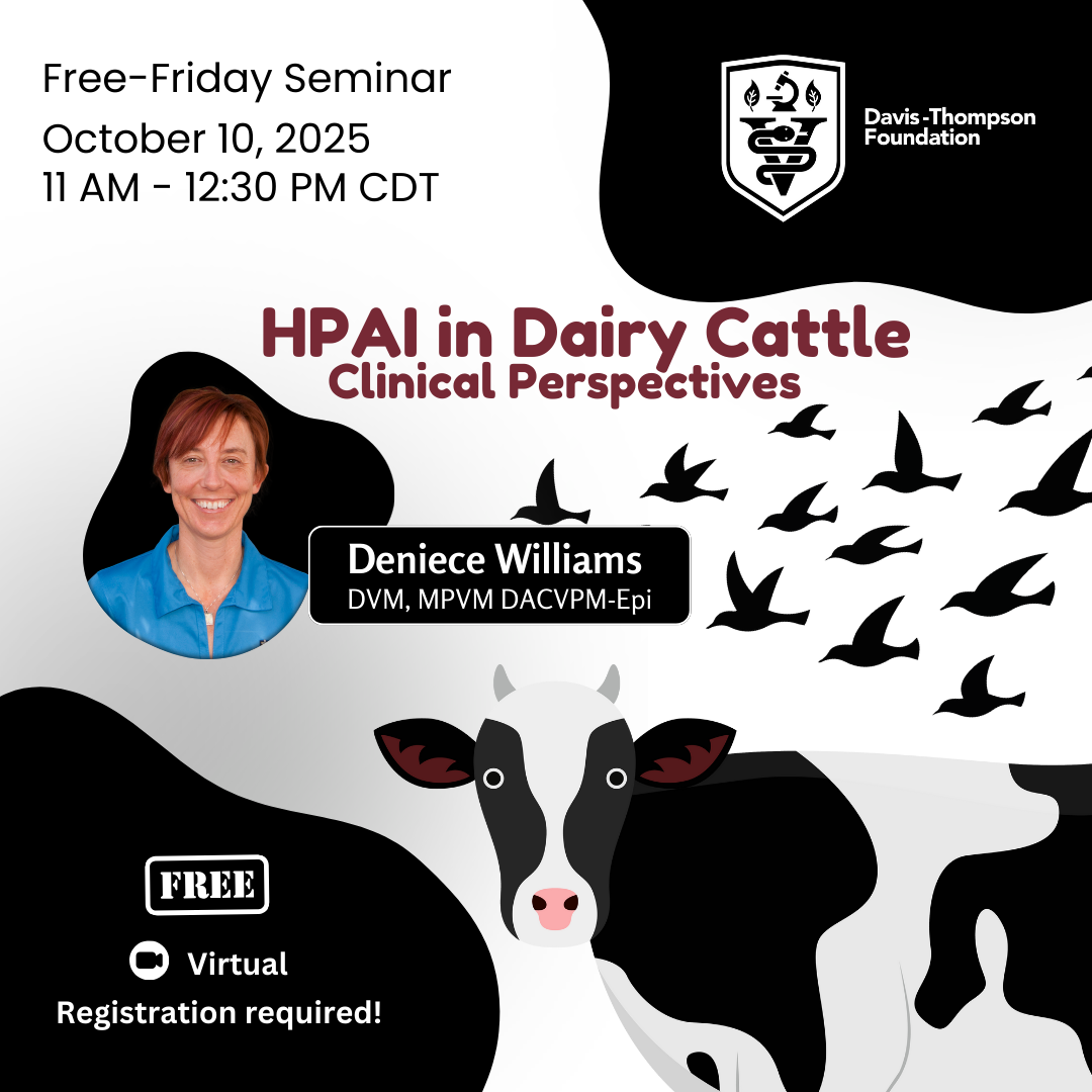 Dear colleagues Don't miss this great free seminar. Registration is required but free https://davisthompsonfoundation.org/event/hpai-in-dairy-cattle-clinical-pers... Paco Uzal Francisco Uzal, DVM, MSc, PhD, Dipl. ACVP Chief Executive Officer Davis-Thompson Foundation Ph: 951 751 0027 E-mail: fauzal@ucdavis.edu<mailto:fauzal@ucdavis.edu> www.davisthompsonfoundation.org<https://www.davisthompsonfoundation.org/> [https://drive.google.com/uc?id=1oticUQZYjDPU-1vMA4wHKvLb2SScHV-J]