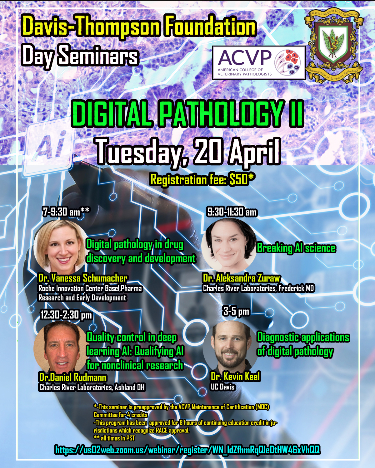 Last year's Digital Pathology day-seminar was a huge hit, so we have brought the speakers back for a second go-round. Unfortunately, as we dig a bit deeper into some of the newer and "pending publication" topics, we have to forego rebroadcasting on this one, so DON'T MISS OUT! You only get one shot at this! During this seminar, participants will learn: - The key principles in building a nonclinical quality system for Deep Learning AI - An example quality control workflow for Deep Learning AI - An example qualification methodology for Deep Learning AI - Gain understanding of the deep learning methods used in pathology - Learn about the different performance metrics used to evaluate deep learning tissue image analysis solutions Register now! (NO rebroadcast - so don't ping me later asking to see the super-secret recording that we didn't even make...) Register here: https://us02web.zoom.us/webinar/register/WN_ldZfhmRqQIeDtHW46xVhQQ?fbclid=Iw... [image: digitalpathologyIIapproved.jpg]