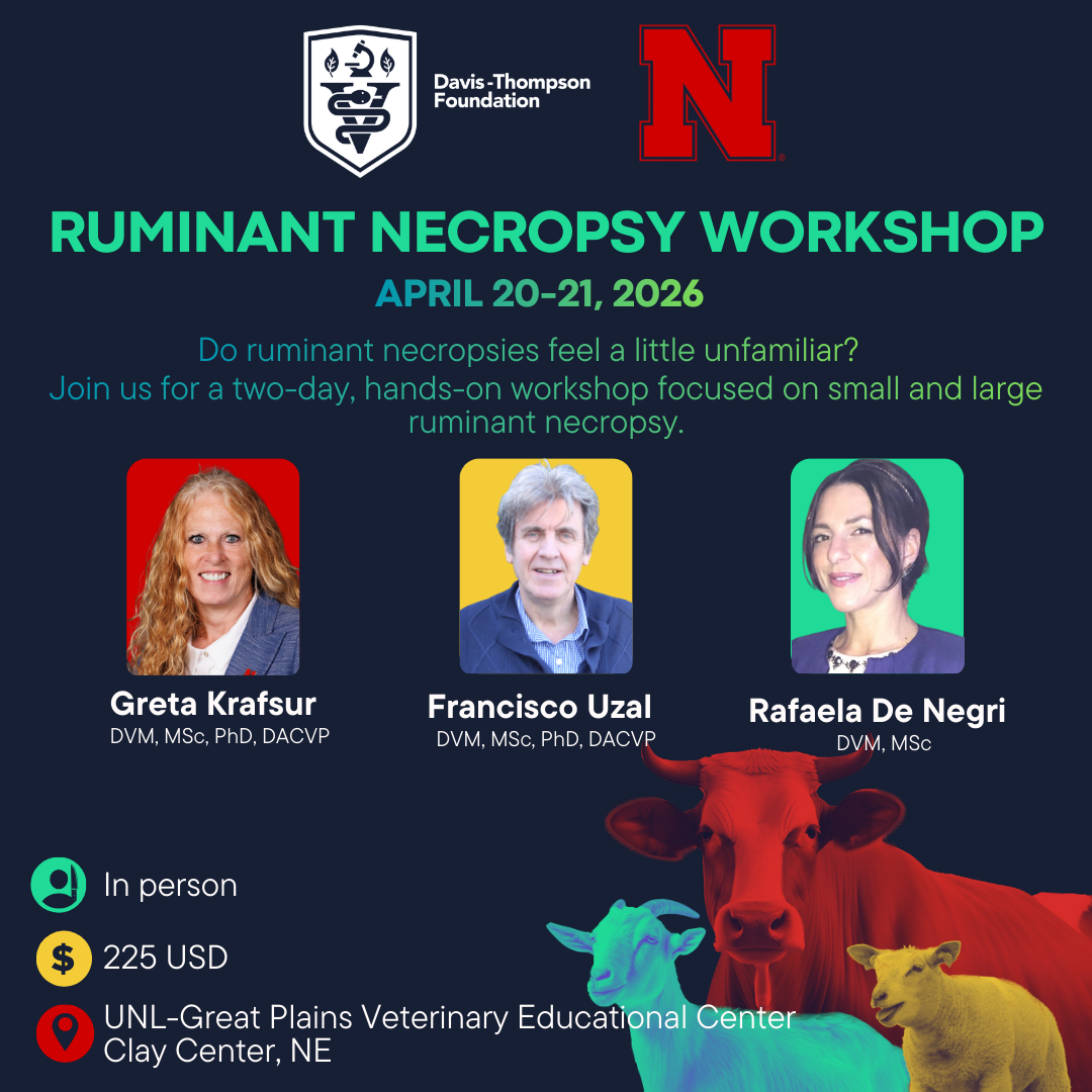 Do ruminant necropsies feel a little unfamiliar—or are these not routine enough at your lab? Join us for a *two-day, hands-on Ruminant Necropsy Workshop* designed specifically for *veterinary pathology residents and early-career pathologists*. This immersive course focuses on *gross diagnostic pathology of small and large ruminants*, emphasizing practical skills you can immediately apply in diagnostic and academic settings. *Ruminant Necropsy Workshop* - A Davis-Thompson Foundation and University of Nebraska- Lincoln collaboration! *Register here 🔗:* https://davisthompsonfoundation.org/event/ruminant-necropsy-workshop/ 📅* April 20–21, 2026* 📍* In-person | UNL–Great Plains Veterinary Educational Center (GPVEC)* *Clay Center, Nebraska* 💲* Cost: $225 USD (includes lectures, hands-on practice, logging, lunches and PPE) * *Course Highlights* - Resident-focused instruction in ruminant necropsy technique - Emphasis on gross lesion recognition and diagnostic reasoning - Integrated lectures and hands-on necropsy experience - Coverage of the alimentary, respiratory, cardiovascular systems, and abortion cases - Small-group, interactive learning *Speakers* - Greta Krafsur, DVM, MSc, PhD, DACVP - Francisco Uzal, DVM, MSc, PhD, DACVP - Rafaela De Negri, DVM, MSc *What’s Included* - Ruminant carcasses for necropsy practice and disposal costs - Personal protective equipment (PPE) (e.g. Tyveks, laboratory’s boots, gloves) - GPVEC on-site student apartment lodging - Breakfasts, lunches, and coffee breaks This workshop is ideal for veterinary pathology trainees and pathologists seeking to build confidence and competence in ruminant necropsy and strengthen gross diagnostic skill. GPVEC is in a remote area, therefore accommodations, breakfast and lunch are included to maximize precious learning time! *You will be required to provide the following, prior to confirmation of your attendance:* - Proof of rabies vaccination (current vaccination documents or recent titter) - Signed “Waiver and Release of Liability” form *Space is very limited. Early registration is encouraged!* [image: Ruminant Necropsy WORKSHOP 2026.png] -- Rafaela De Negri, DVM, MSc <https://www.linkedin.com/in/drdenegri/> pronouns: she/her/hers Veterinary Pathologist/Assistant Professor Murray State University, Breathitt Veterinary Center <https://www.murraystate.edu/> Vice-President of Organizational Operations <https://davisthompsonfoundation.org/> *Chair, Social Media & Marketing Committee, <https://davisthompsonfoundation.org/>* Davis-Thompson Foundation <https://davisthompsonfoundation.org/> Commission Advisory Group, American Veterinary Medical Association <https://www.avma.org/> Professional Enrichment Committee, American Association of Veterinary Laboratory Diagnosticians <https://www.aavld.org/>